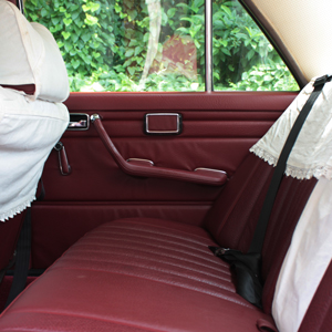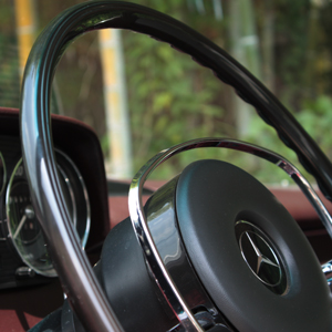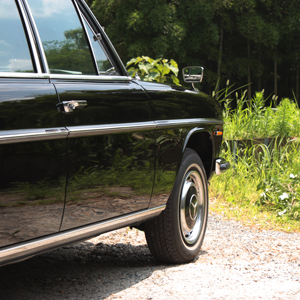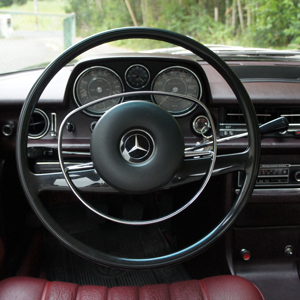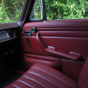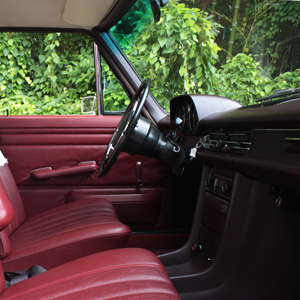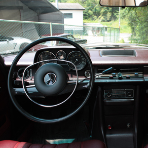 こちらの車両はW115の前期型になり、三角窓、片側フェンダーミラーなどクラシカルな雰囲気たっぷりです。 外装は磨きをかけてとてもきれいな状態ですし、内装もMBTexでほとんどやれていません。 珍しいコラムのマニュアル車です。